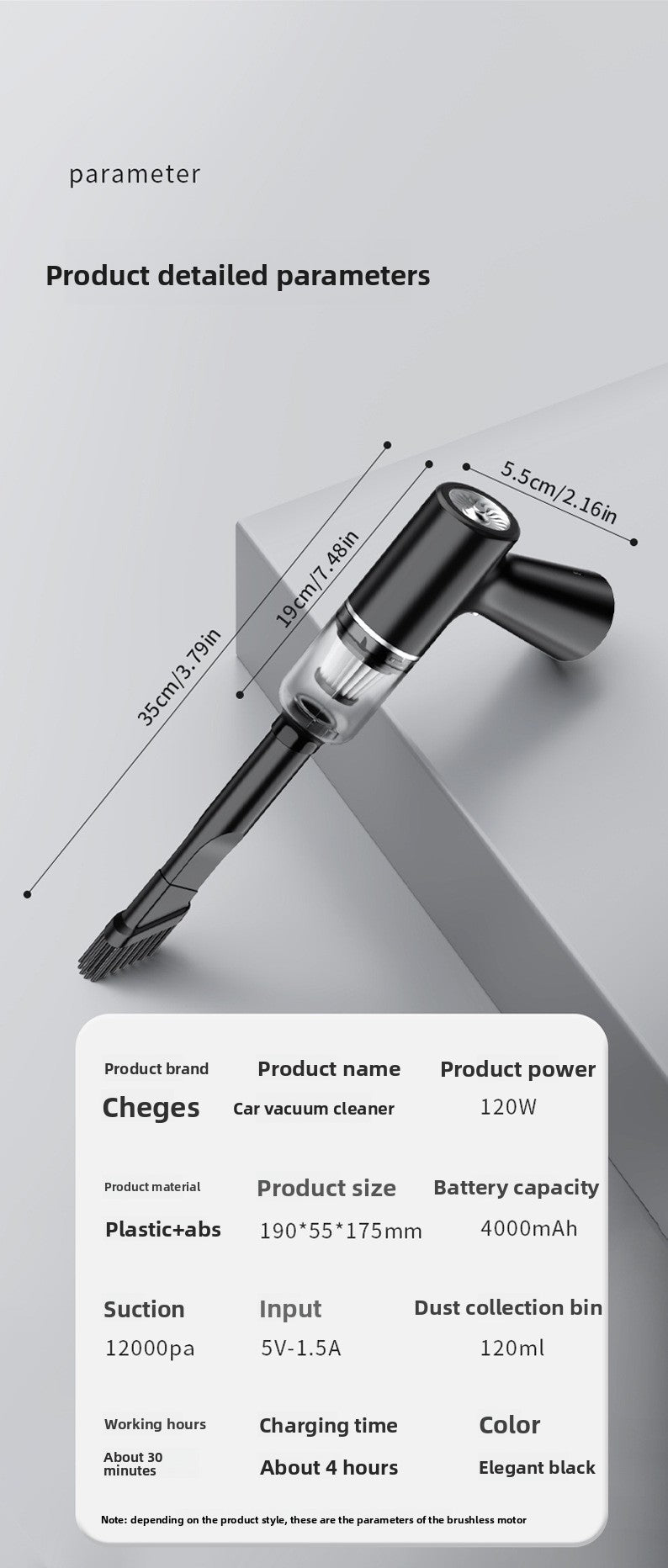 105 Brushless Motor Model 04: Single Package Size 21.5*18*6.1cm, Gross Weight: 497g, Suction Power Level 1: 6000, Level 2: 12000, Battery Life About 30 Minutes, Charging Time: About 4 Hours